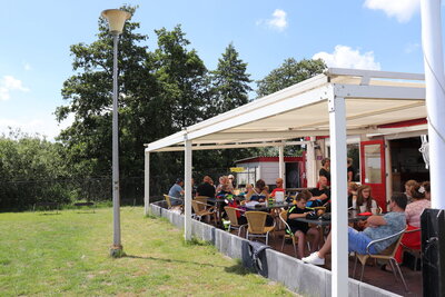 Voor het clubhuis ligt het panoramterras hier kan je heerlijk zitten en genieten van alle activiteiten op en rond het water.